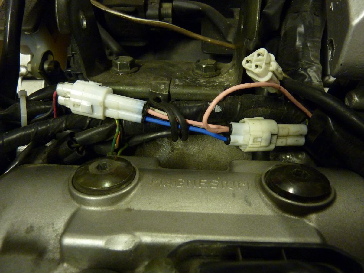 Anfangs gab es keine passenden Steckverbinder für den Gangsensor. Also was tun? Einen sogenannten Stromdieb (Abgreifklemme mit Schneidklemmen) im Bereich der Motorhitze einzusetzen ist wohl keine so gute Idee. Daher hatte ich anfangs auch den pinkfarbenen Draht direkt in den Stopfen des vorhandenen Gangsignalsteckers reingepfriemelt. Dass das sehr schlecht geht und jeglicher Perfektion entbehrt, kann man schon erahnen.