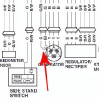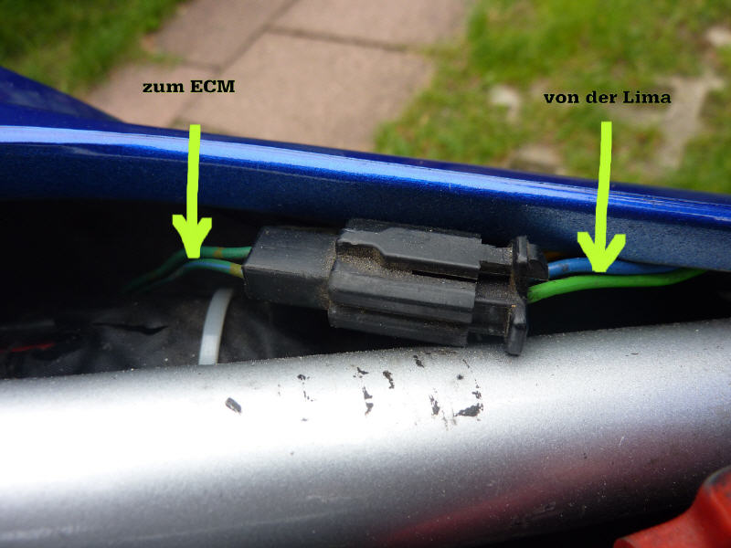 Von der Lima kommend gehen zwei Drähte zu dem Steckverbinder links neben der Batterie am Rahmen (siehe Bild). Die ankommenden Leitungen sind grün und blau. Die weitergehenden Leitungen zum ECM sind dann aber grün und grün/blau. Grün/blau geht an N+ des ECM (Pin 26) und Grün geht an N- des ECM (Pin 30 ).